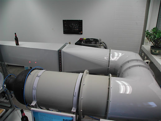 Technische Daten: Allgemeines: Bei dem Windkanal handelt es sich um einen Niedergeschwindigkeitswindkanal vom Typ „Göttinger Bauart“ mit offener Messstrecke.. Im Windkanal kann eine Strömungsgeschwindigkeit von 0,1 bis ca. 60 m/s stufenlos über eine elektronische Steuerung eingestellt werden. Die Luftströmung wird durch ein einstufiges Hochleistungsradialgebläse erzeugt. Im Unterschied zum hauseigenen „DKD Windkanal“ besitz dieses Model einen Thermostat. Technisch Daten: